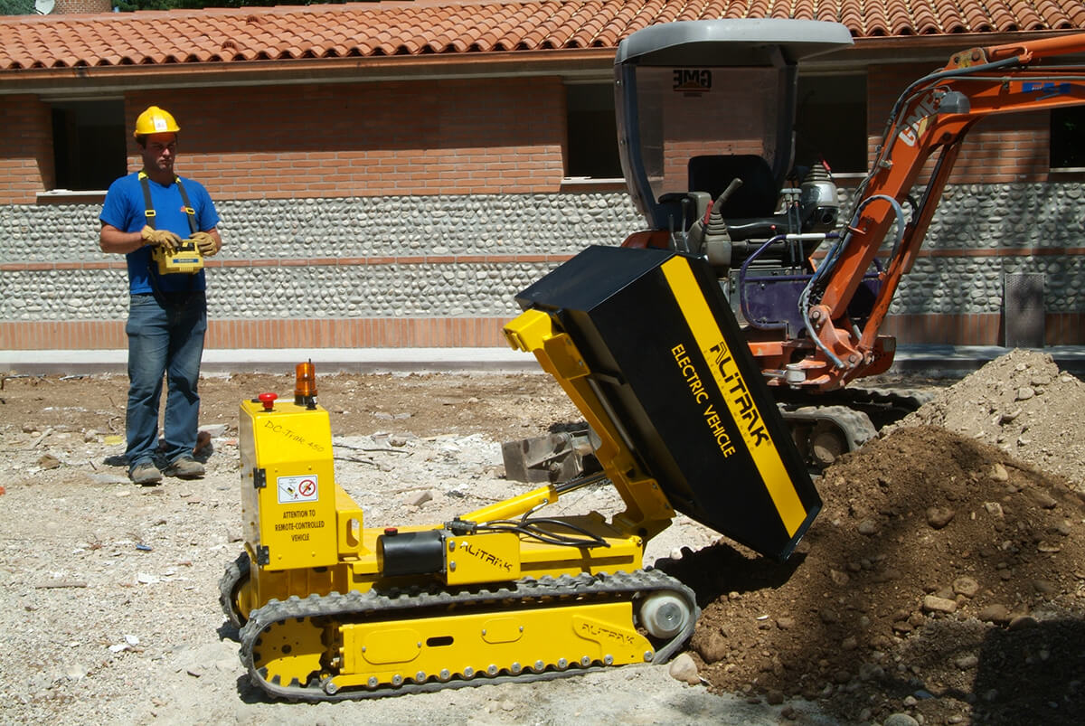2つの強力なモーターを搭載し、平らな場所であれば自ら旋回が可能です。また、厳しい地盤条件にも対応するよう設計されており、階段も昇降する事ができます。DCT-450Pには、無線リモコンが運転システムに採用されており、無人化での作業も可能です。