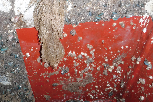 長年、貝や藻の付着により効率が悪化し、清掃作業に苦労していました。従来の重塗装に比べ、貝や藻の付着が格段に減少しました。(赤色部:弊社塗料 灰色部:従来塗料 白色部:貝・藻付着部分)